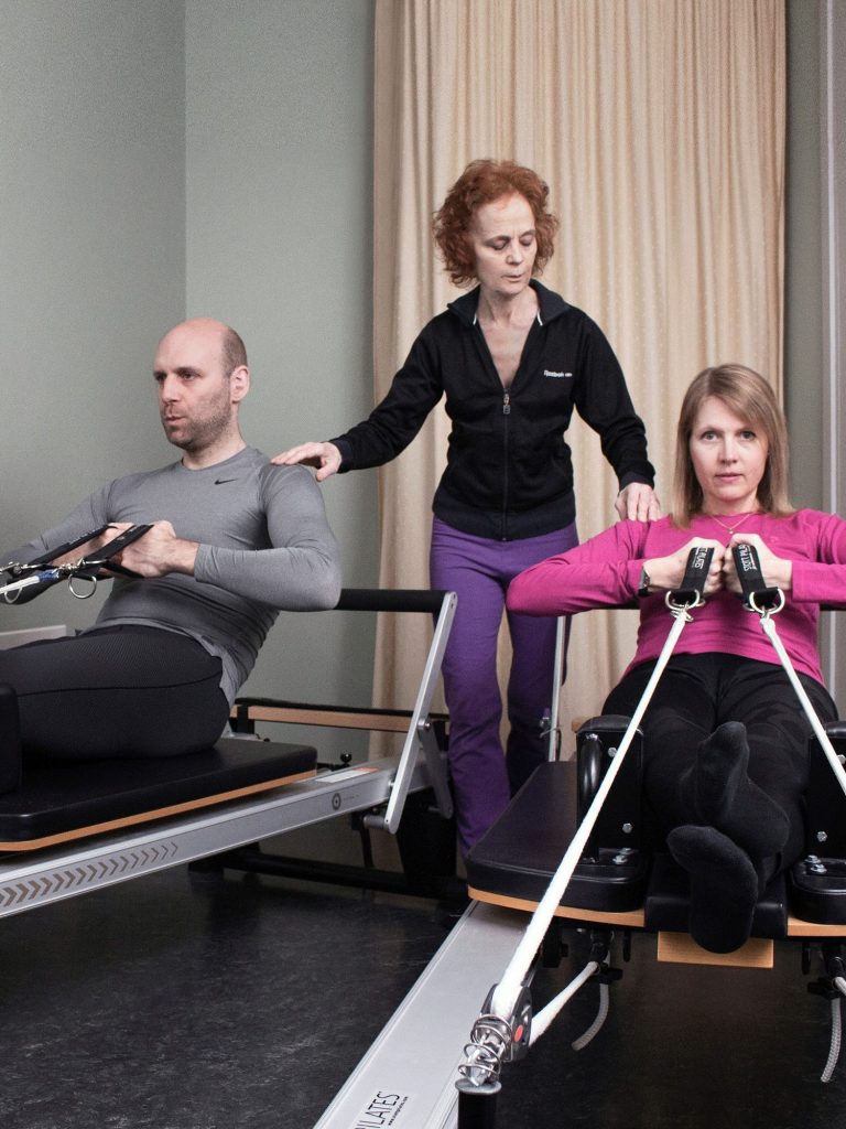 Två personer tränar samtidigt i var sin Pilatesmaskin med personlig instruktör, fortfarande individuellt men ändå tillsammans. Läs mer här